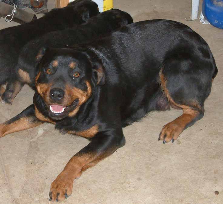 Angel was our first Rottweiler. She had taught us a lot and we greatly miss her. Angle was a very healthy and happy girl who died before her time. We lost Angel to bloat, we never had experience this before and when we realized what the problem was it was too late. You were our loving energetic girl, Angel. You always watched over the kids and made sure they were safe. You were the best mother ever. I wish we would have shown you. We were so new to having show dogs, and we didn't realize we needed to tape your ears so they laid flat, you always had them folded back as you were always smiling. We miss you dearly.